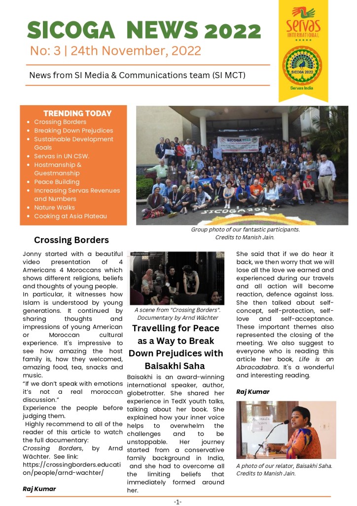 Servas is owned by an accredited non-governmental organization and has been affiliated with the United Nations since 1973. SICOGA 2022 was organized by Servas International at the Asia Plateau, Panchgani in Maharashtra, India from 22 to 28 November. Servas follows the motto: Traveling for Peace while breaking down cultural barriers & prejudices.