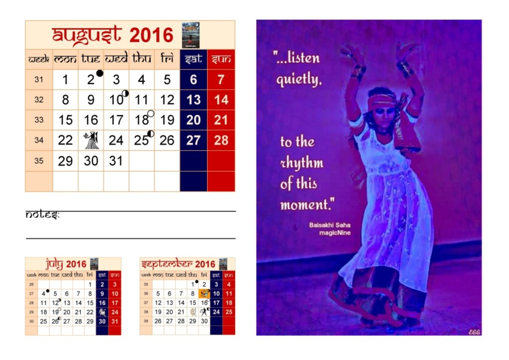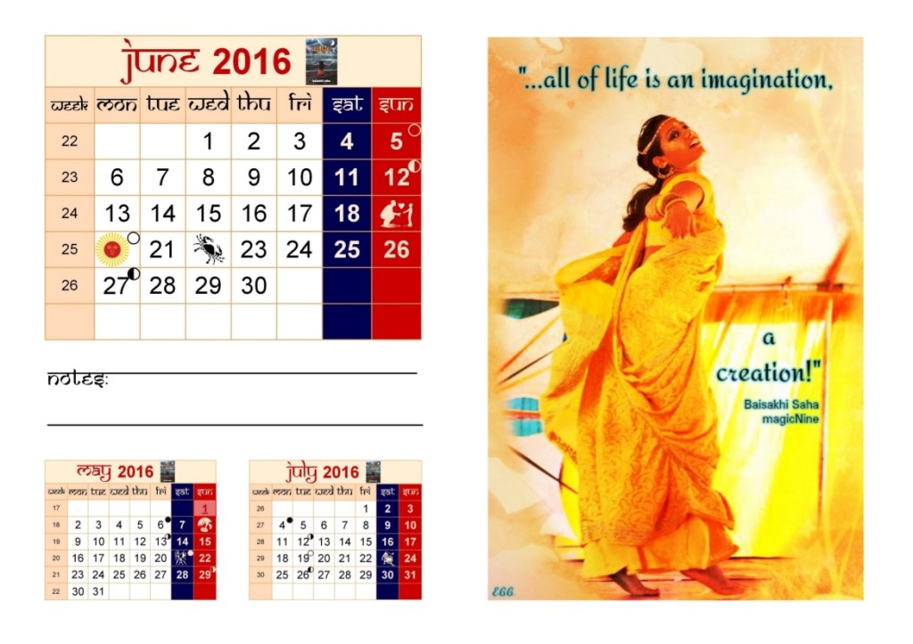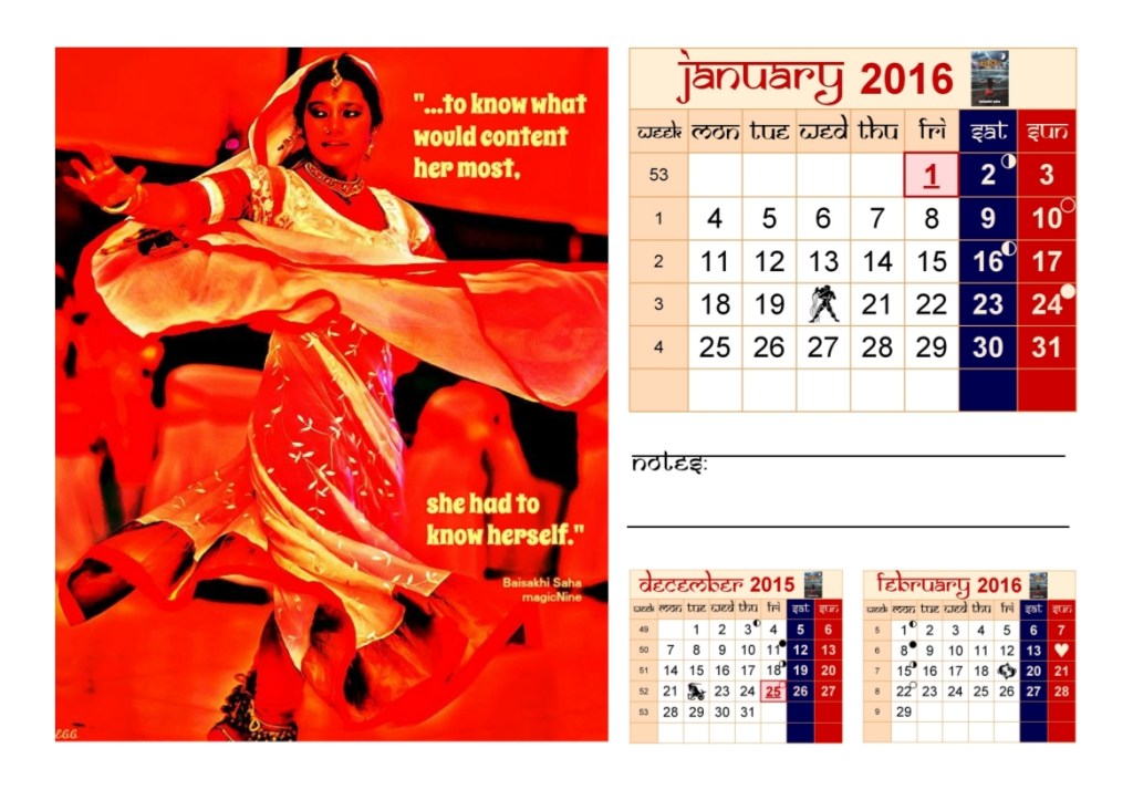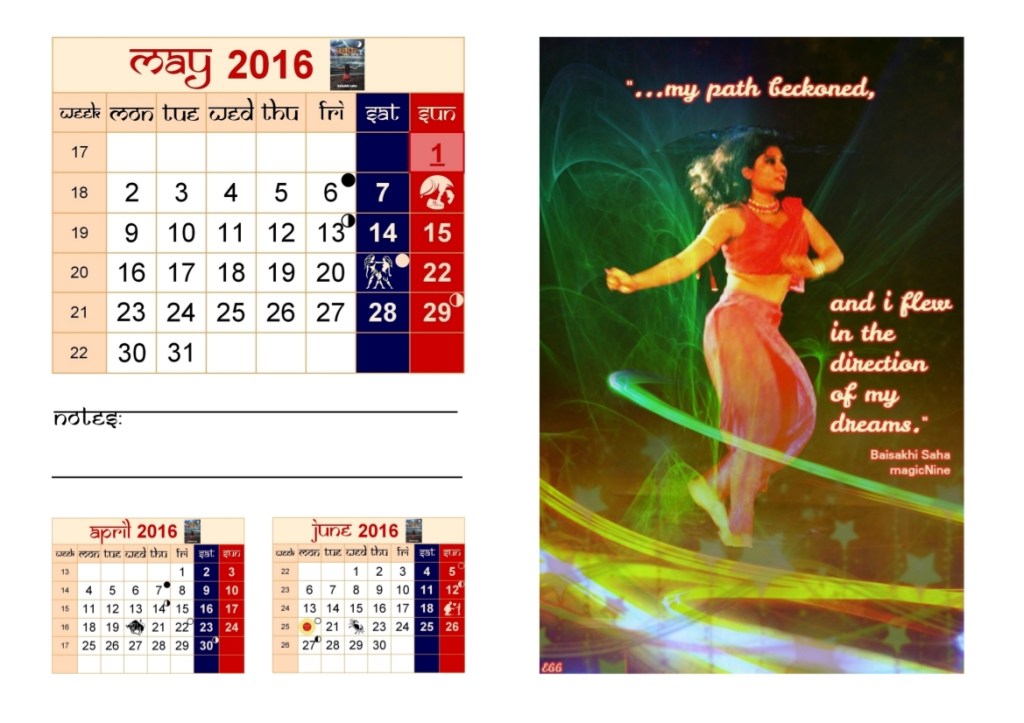 Inspirational Calendar “magicNine” is based on the book magicNine authored by Baisakhi Saha. A Canadian artist while reading the book felt inspired to create some inspirational posters of it, which in turn gave birth to the idea of a calendar. ‘magicNine -a true account of the inner adventures of a young girl to consciousness’ is a book about how signs and synchronicities guide us on our destiny path. Buy here.